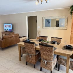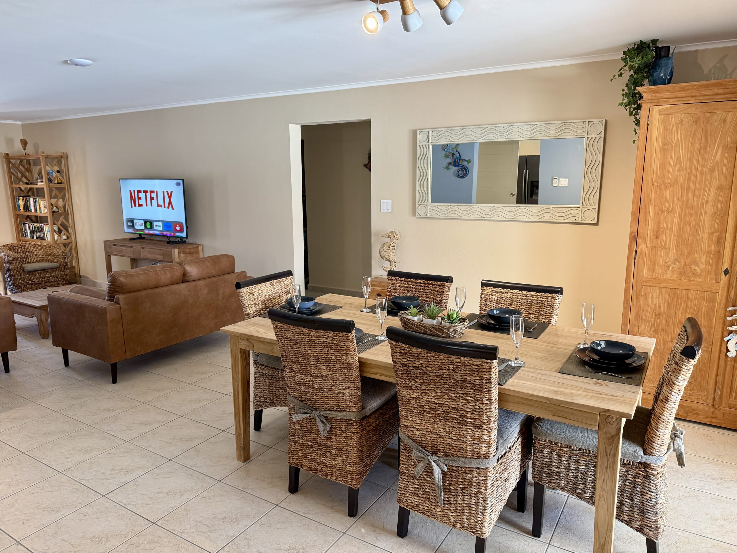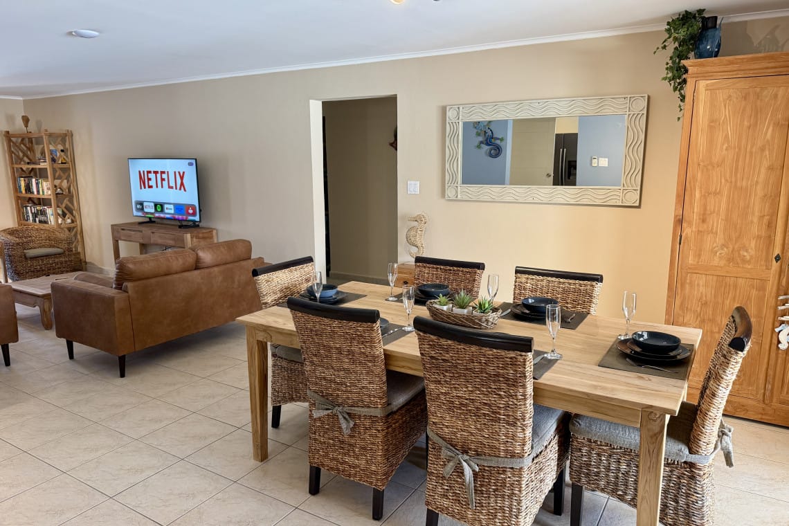 A cozy and bright living area with comfortable seating, a flat-screen TV with Netflix, and direct access to the dining space. Perfect for relaxing after a day at the beach or pool.