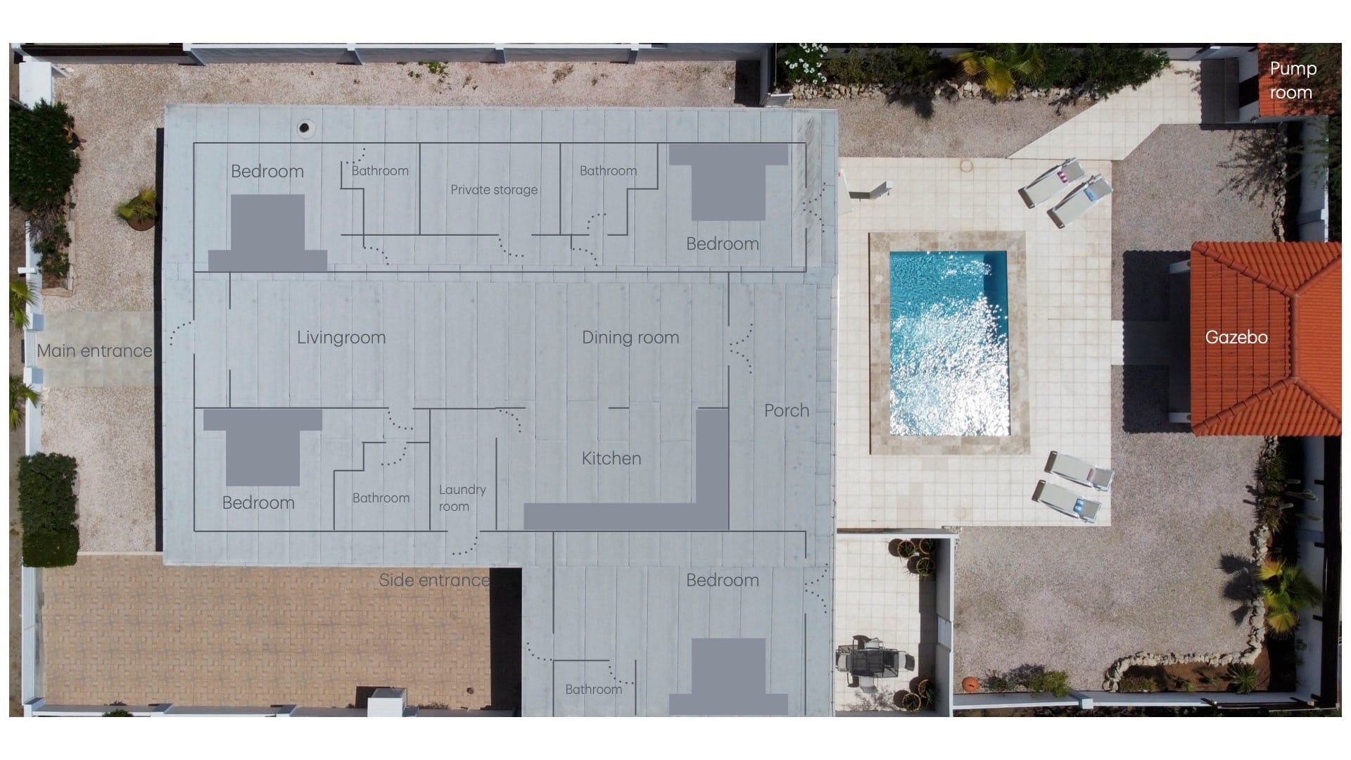 The villa features four spacious bedrooms, each with comfortable bedding, closet space, and air conditioning for a restful night’s sleep. The layout allows privacy for families or groups, with bedrooms spread across different areas of the house.